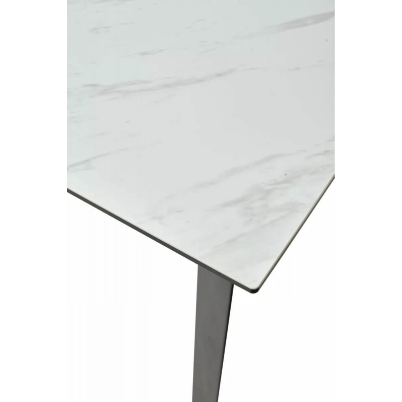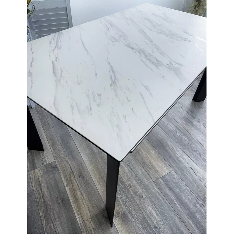 Столешница выполнена по технологии «керамика на стекле» (толщина 13 мм: 3 мм итальянская керамика + 10 мм закалённое стекло). Матовая поверхность в декоре белый мрамор устойчива к царапинам и загрязнениям, не впитывает влагу, выдерживает перепады температур и легко очищается.