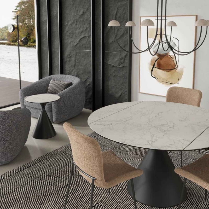 Подстолье и опорная нога изготовлены из прочного металла с черным порошковым покрытием, устойчивым к внешним воздействиям. Лаконичная форма и глубокий оттенок подчеркивают современный характер модели, делая ее выразительным акцентом в обеденной зоне.
