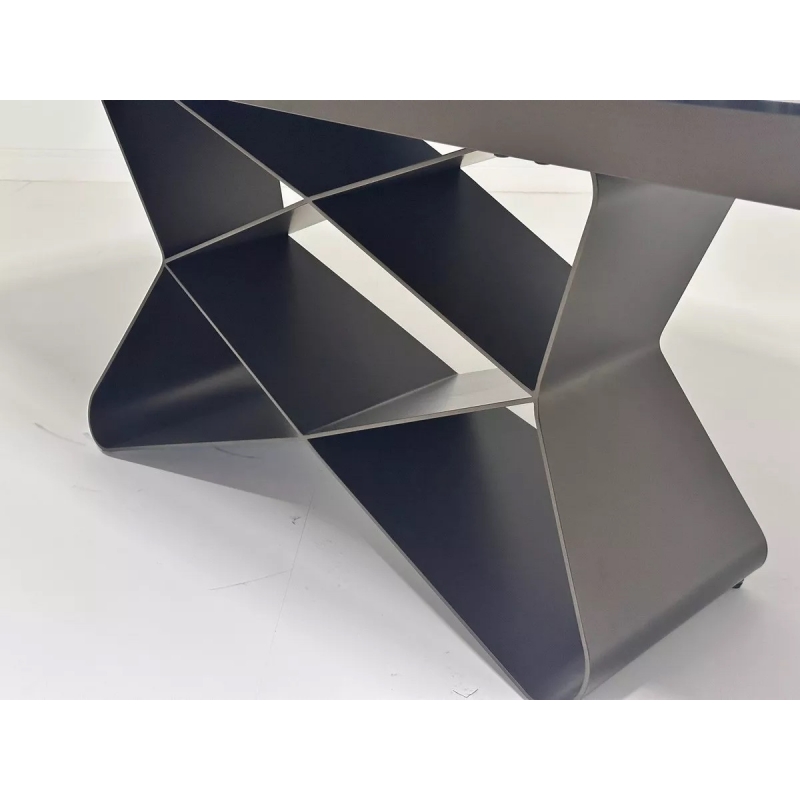 Основание стола выполнено из прочного металла и окрашено в изысканный оттенок шоколадного золота, добавляющий модели тепла и современного благородства. Широкие опоры обеспечивают устойчивость конструкции и подчёркивают её премиальный характер.