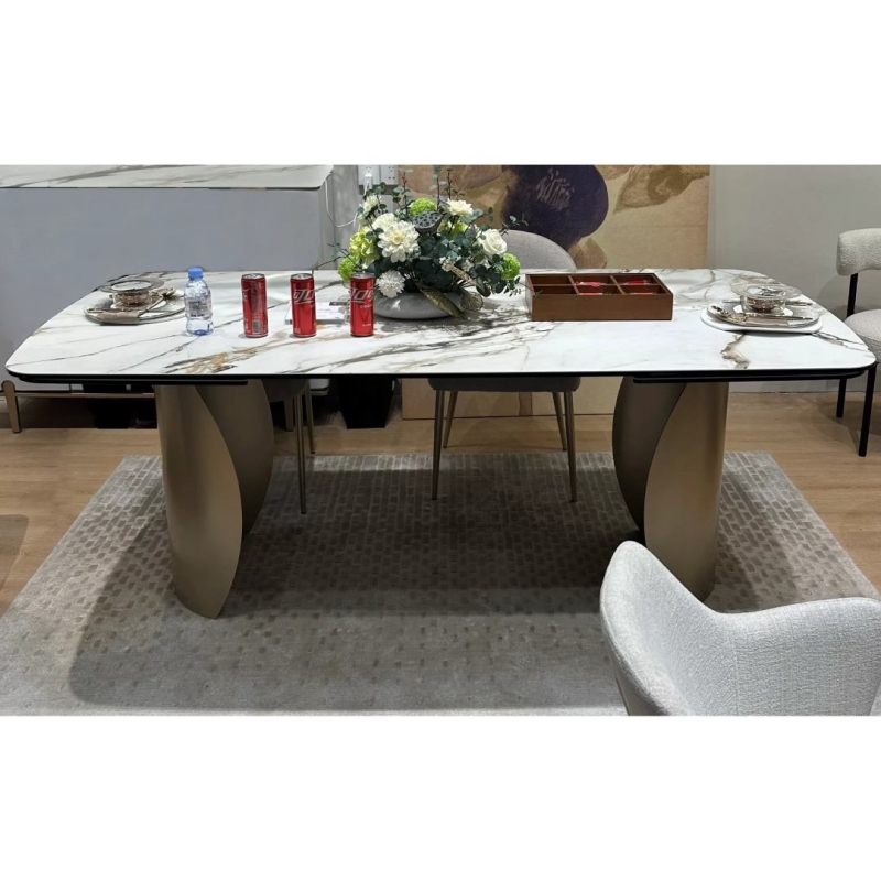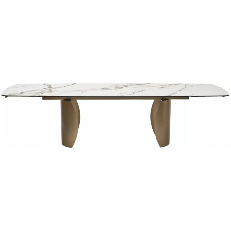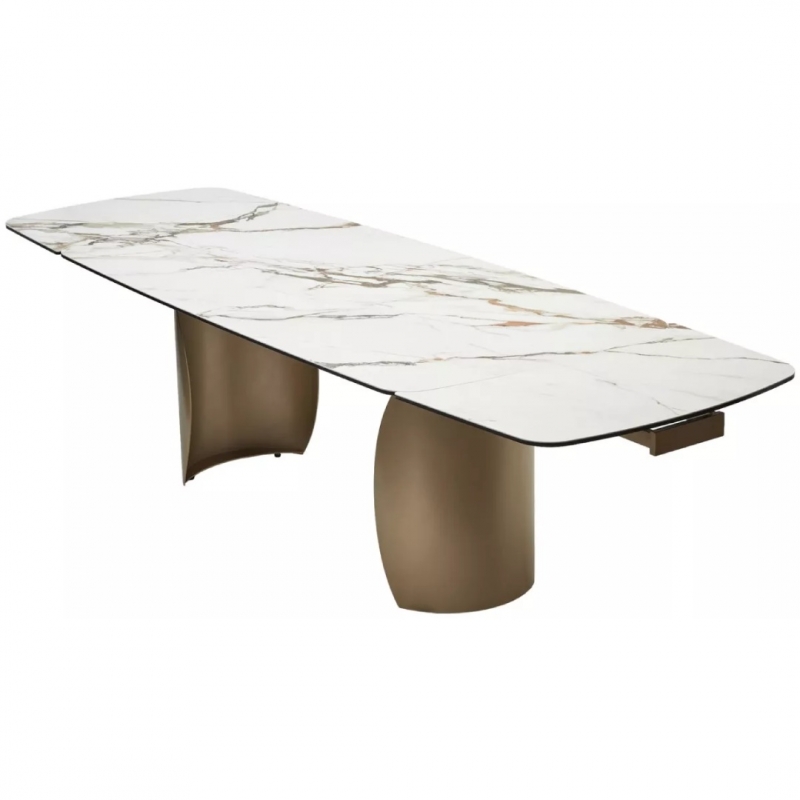 Двухсторонняя торцевая система раскладывания позволяет увеличить длину стола на 50 или 100 см — до 250 или 300 см. Две независимые вставки выдвигаются с торцов, обеспечивая удобство трансформации. Рисунок вставок может отличаться от основного и не являться его продолжением, подчёркивая природную эстетику керамики.