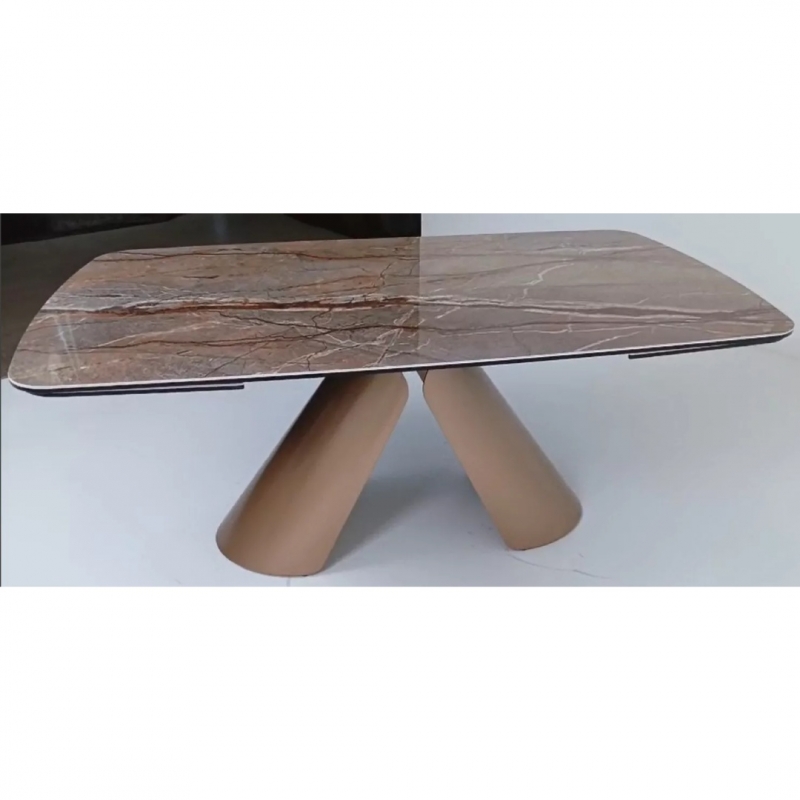 Столешница выполнена из прочной глянцевой керамики на стекле общей толщиной 14 мм (4 мм керамика + 10 мм стекло). Поверхность устойчива к царапинам, не впитывает загрязнения, выдерживает высокие температуры и легко очищается. Декор серо-коричневого мрамора (Grand Cordillera) придаёт столу выразительный премиальный акцент и подчёркивает современный характер модели.