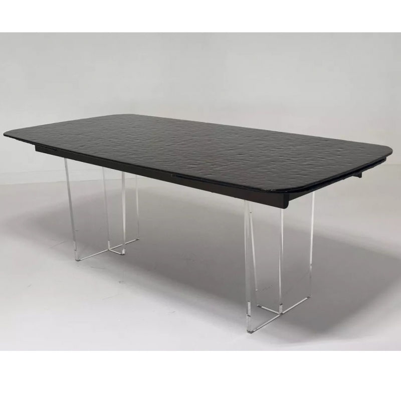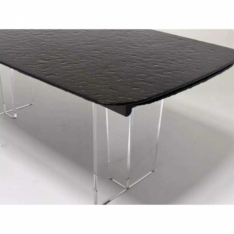 Основание стола выполнено из прозрачного акрила, что создаёт визуальную лёгкость, а металлическая рама серебристо-серого цвета придаёт конструкции устойчивость и долговечность. Стол поставляется в двух коробках для удобства транспортировки.