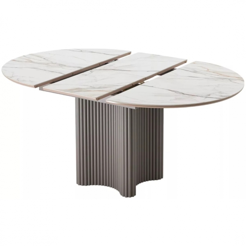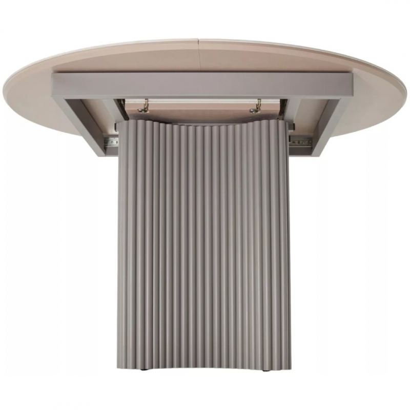 Каркас и ножки выполнены из металла в цвете латте матовый, обеспечивая прочность и устойчивость конструкции. Простая и надёжная система раскладывания позволяет увеличить диаметр стола за один шаг с минимальными усилиями.
