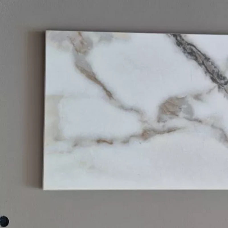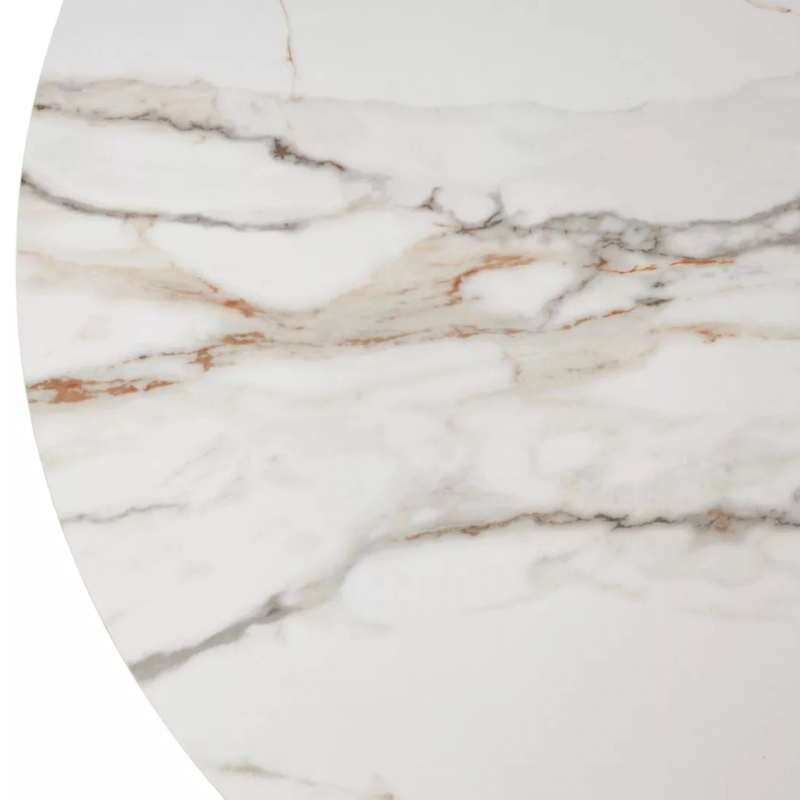 Столешница изготовлена из испанской керамики толщиной 5,5 мм на МДФ 16 мм (общая толщина 21,5 мм), устойчива к царапинам, загрязнениям и высоким температурам. Декор бело-коричневый мрамор придаёт интерьеру элегантность и лёгкость, подчёркивая премиальный характер стола.