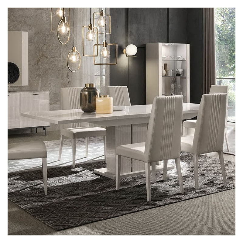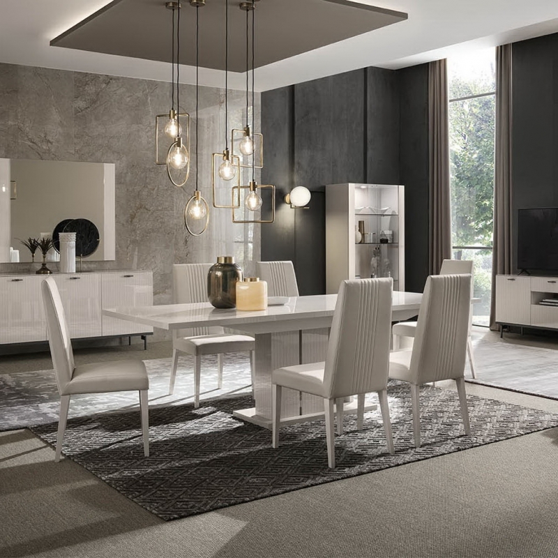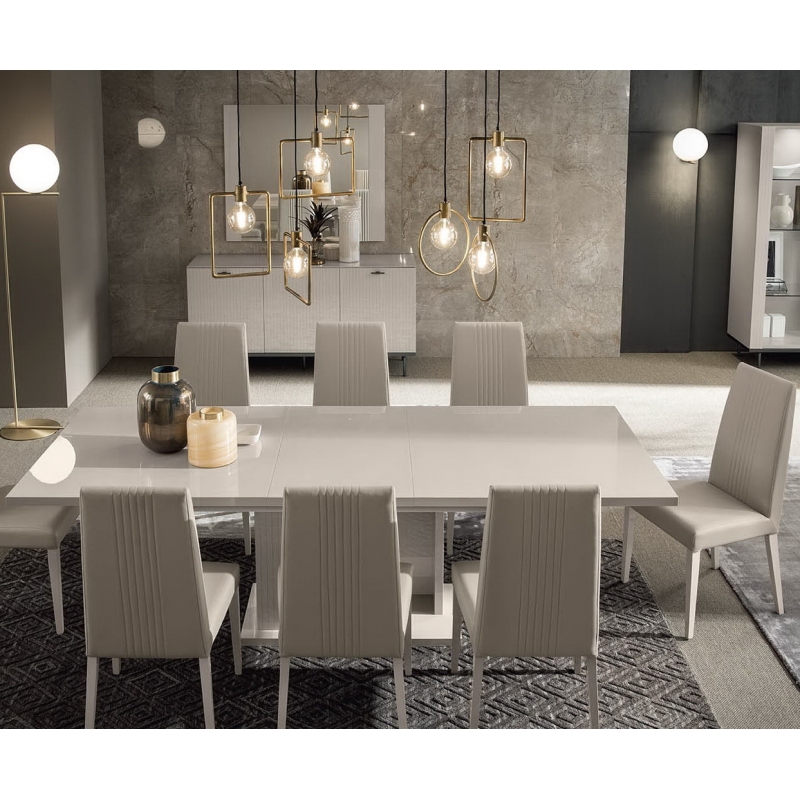 Итальянский раздвижной обеденный стол из коллекции Claire фабрики Alf Italia, арт. PJCL0613. Размер стола 160х100 см в сложенном виде и 210х100 см в разложенном виде. Покрытие выполнено из эко шпона с шелкографическим вертикальным рисунком, покрытого высокопрочным глянцевым жемчужным лаком.
