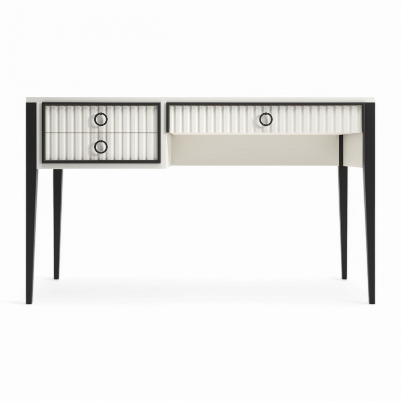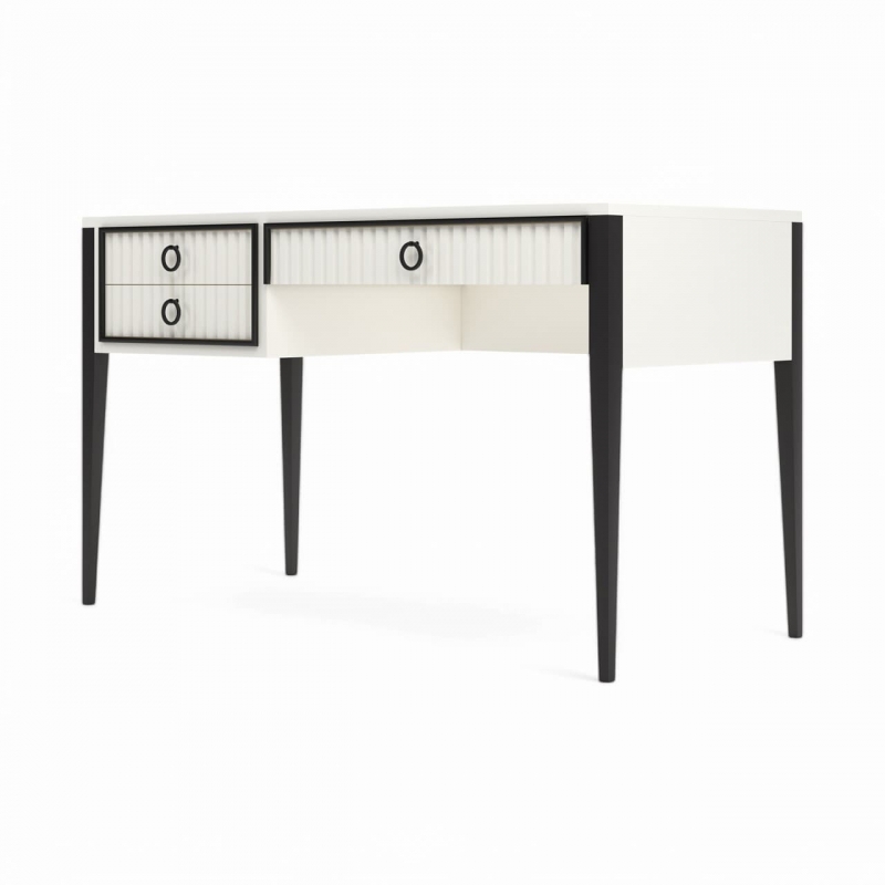 Фасадная часть ящиков письменного стола украшена вертикальными фрезеровками - каннелюрами. Отделка: Эмаль Молочного цвета. Ножки окрашены чёрный цвет.