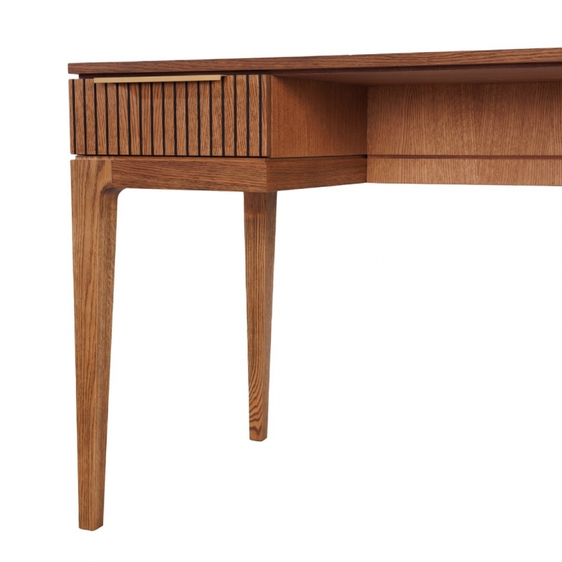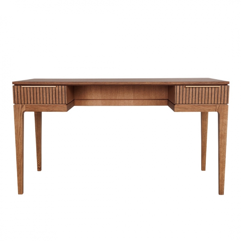 Функциональный письменный стол из коллекции Bryce бренда Vissam (арт. 21025.01), выполненный в американском стиле и станет выразительным акцентом в интерьере кабинета. Дизайнерский письменный стол Bryce на высоких ножках оснащен двумя выдвижными ящиками с доводчиками, обеспечивающими плавное и бесшумное закрывание. Рельефный фасад из вертикальных реек придаёт поверхности визуальный ритм и глубину, подчёркивая современный характер модели.