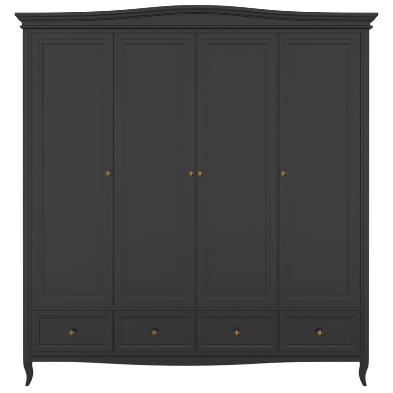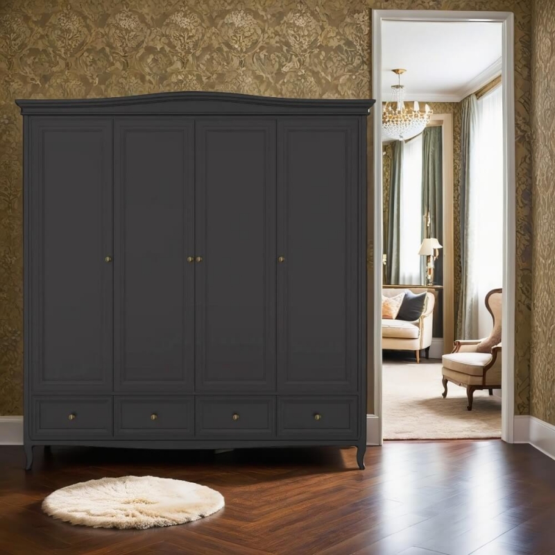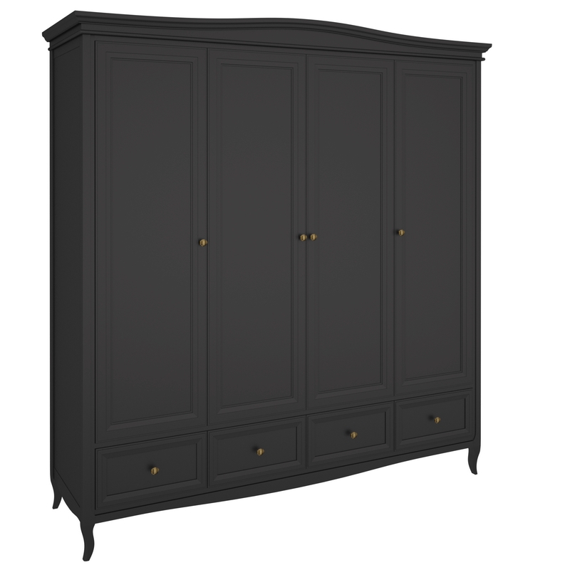 Стильный четырехдверный шкаф Majessa (Aletan, арт. М804BL) с четырьмя ящиками, в чёрном цвете — элегантное решение для спальни в неоклассическом стиле. Шкаф Алетан Маджесса изготовлен из массива дерева и МДФ с многослойной эмалевой отделкой, гарантирующей долговечность.