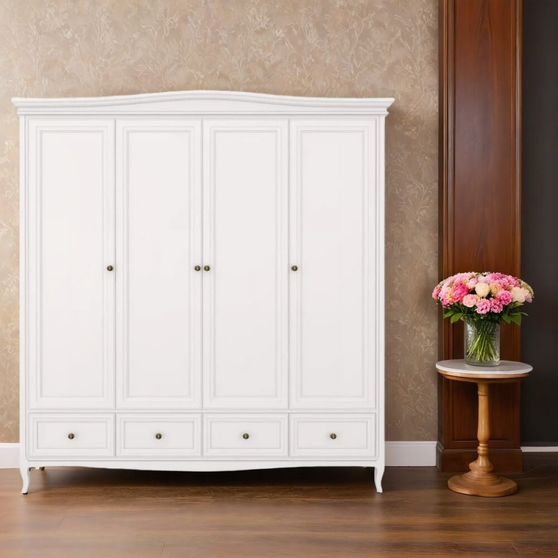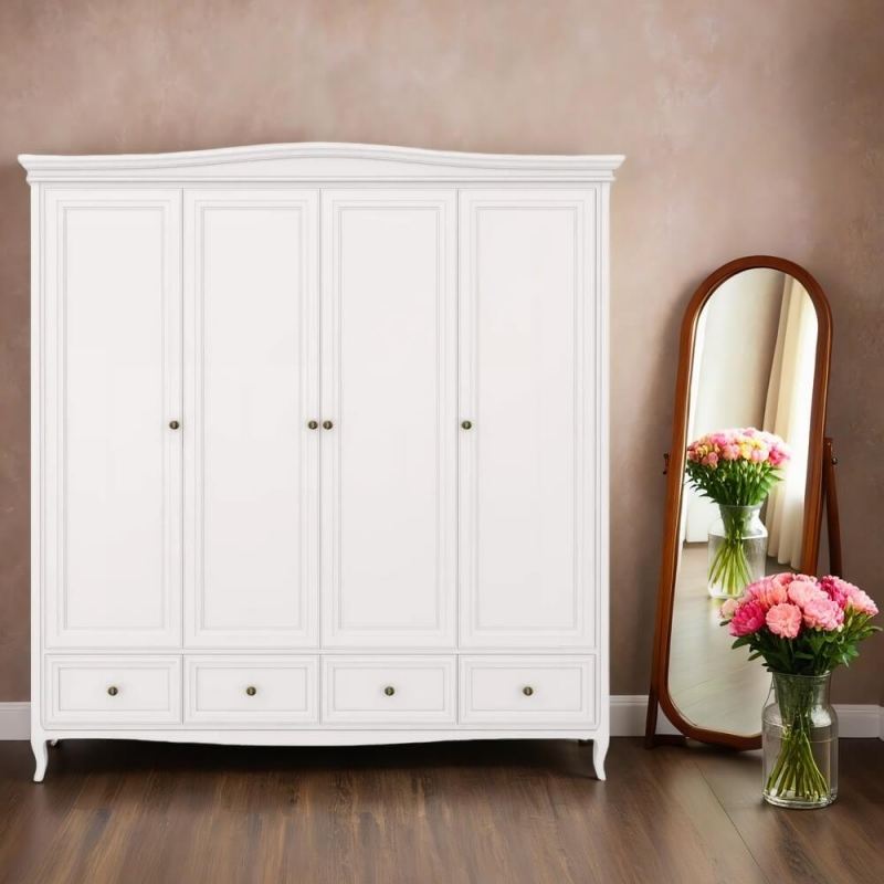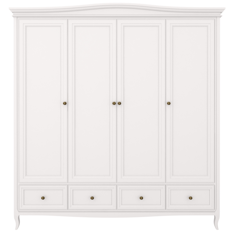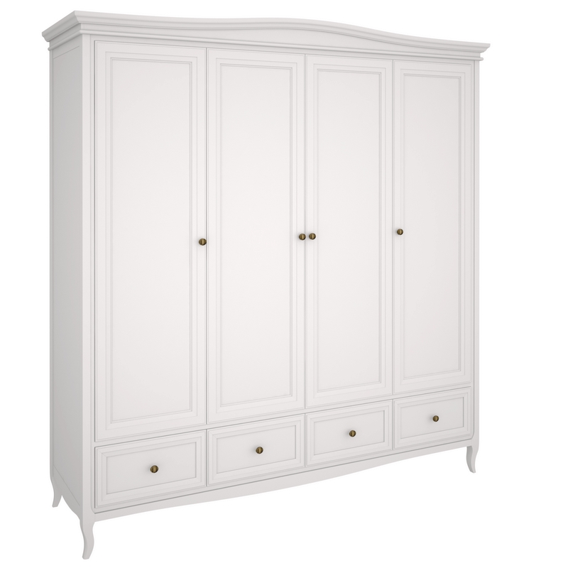 Стильный четырехдверный шкаф Majessa (Aletan, арт. М804W) с четырьмя ящиками, в белом цвете — элегантное решение для спальни в неоклассическом стиле. Шкаф Алетан Маджесса изготовлен из массива дерева и МДФ с многослойной эмалевой отделкой, гарантирующей долговечность.