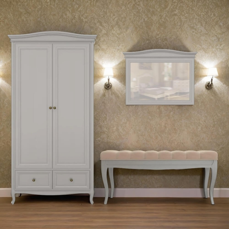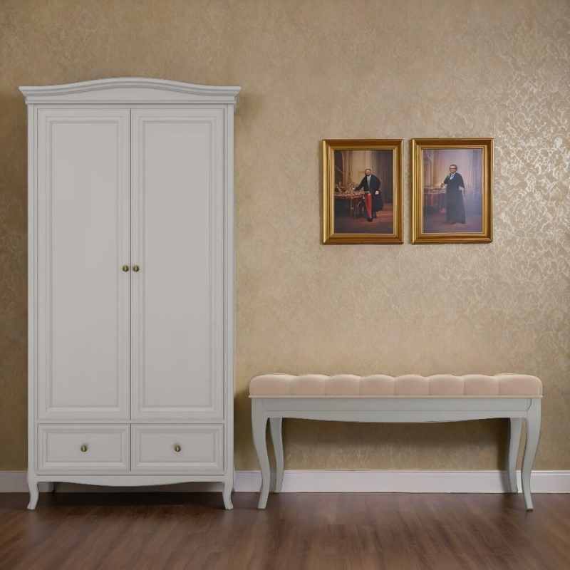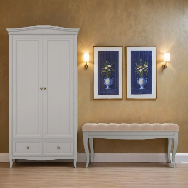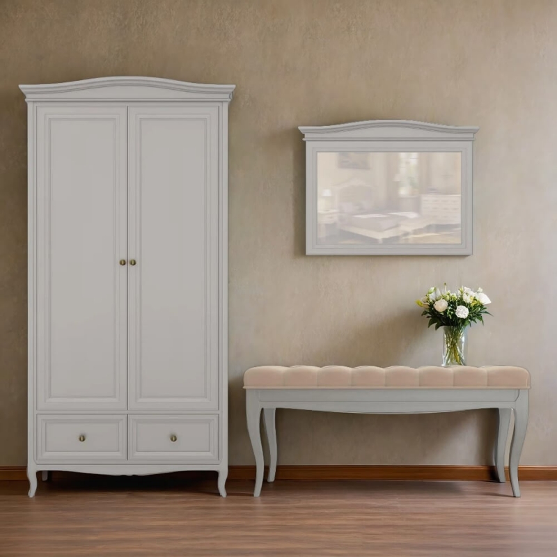 Стильный небольшой двухдверный шкаф Majessa (Aletan, арт. М802G) с двумя ящиками, в сером цвете — элегантное решение для спальни в неоклассическом стиле. Шкаф Алетан Маджесса изготовлен из массива дерева и МДФ с многослойной эмалевой отделкой, гарантирующей долговечность.