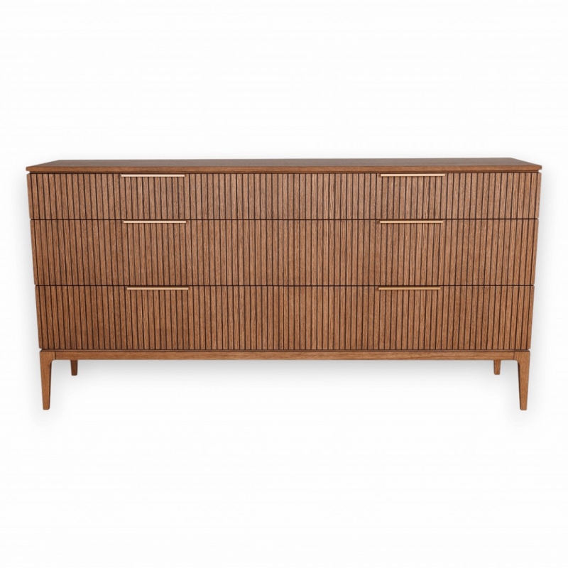 Фасады с рельефной рейкой формируют выразительный ритм и глубину поверхности, создавая эффект лёгкой тени и динамики при изменении освещения. Этот приём подчёркивает архитектурность коллекции и придаёт мебели визуальную сложность без избыточного декора. Основные элементы выполнены из массива и шпона дуба — натурального материала с характерной текстурой, глубокими тёмными прожилками и мягким естественным блеском.