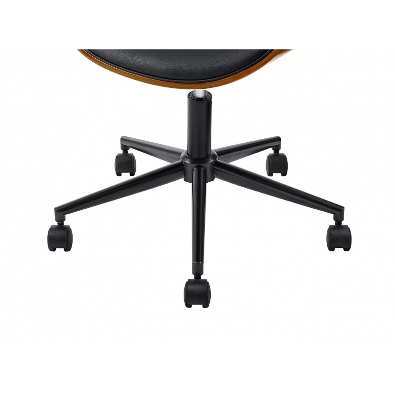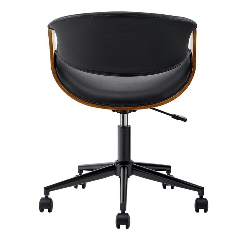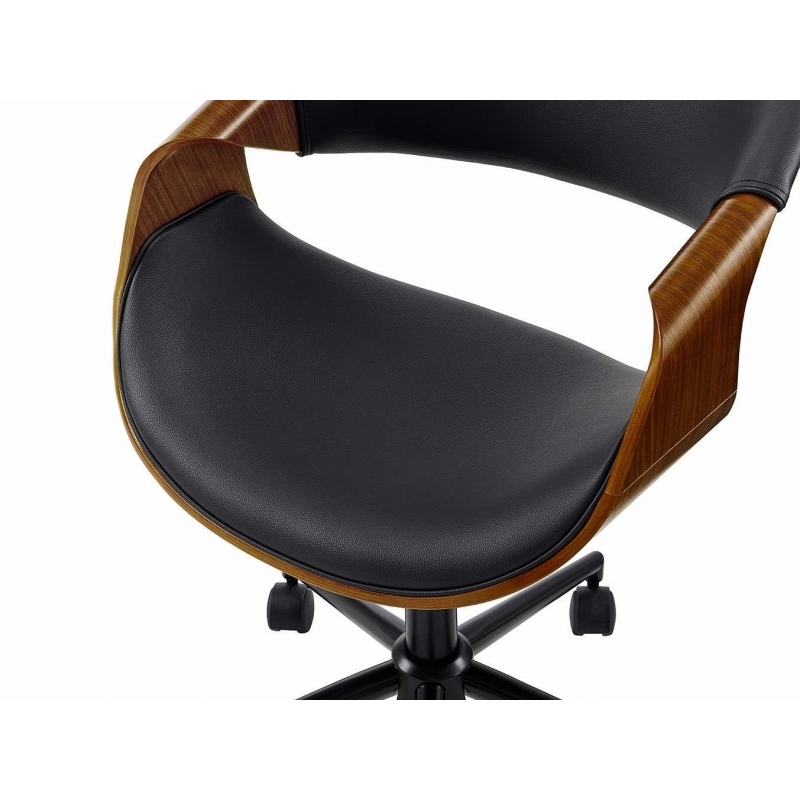 Комфортный дизайнерский стул модели JY1829-3 бренда Qwerica Home (Q-Home). Стул имеет удобную поддерживающую спинку и подлокотники, выполненных из натурального шпона ореха, а также способен вращаться. Обивка - износостойкая практичная экокожа черного цвета.