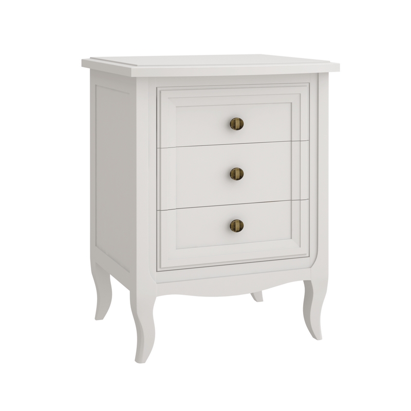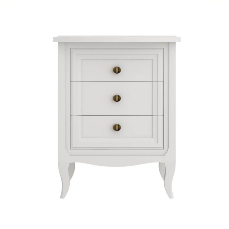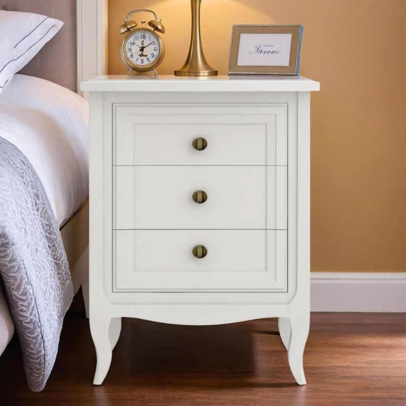 Прикроватная тумба Majessa (Aletan, арт. М303W) с тремя ящиками, в белом цвете — элегантное решение для спальни в неоклассическом стиле. Тумбочка Алетан Маджесса изготовлена из массива дерева и МДФ с многослойной эмалевой отделкой, гарантирующей долговечность.