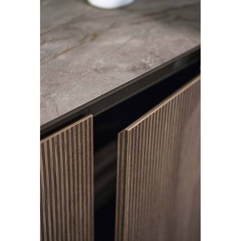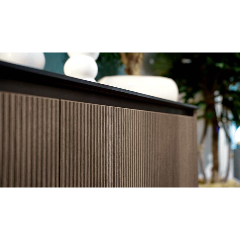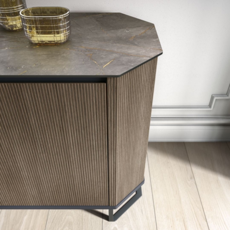 Стильная итальянская ТВ тумба Hexagon от фабрики Status Italy (арт. HEDCNPT01) с тремя дверцами на плавных доводчиках. Внутренняя часть ящиков устойчива к царапинам. Изысканная матовая столешница с отделкой Gold Marble выполнена из CDF плиты толщиной 10 мм. Прочная конструкция: панели из искусственного дерева (28 мм) в цвете антрацит с кромкой АБС-пластика. Отделка Honey Ribbed на боковых и задних панелях (18 мм) придает теплоту и текстуру, а кромки из АБС-пластика обеспечивают долговечность и стиль.