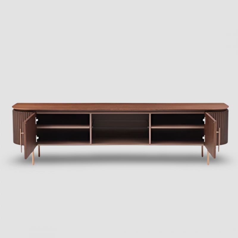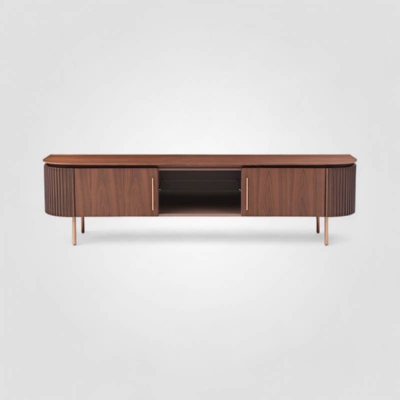 Стильная ТВ-тумба Morisone, арт. 01996, от бренда Art Fabric — элегантное сочетание натуральных материалов, премиальной отделки и современного лаконичного дизайна. Фасады и корпус выполнены из шпона американского ореха с характерным тёплым оттенком и насыщенным древесным рисунком, который придаёт модели благородство и создаёт уютную атмосферу в интерьере. Плотная основа из МДФ обеспечивает устойчивость к деформациям и идеальную ровность поверхностей.