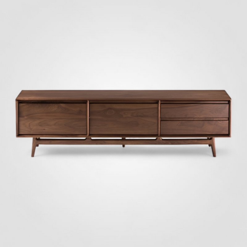 Стильная ТВ-тумба Trigg 160, арт. 0063, от бренда Art Fabric — воплощение эстетики mid-century и естественной выразительности натуральной древесины. Корпус, фасады и опоры выполнены из массива ясеня, благодаря чему модель отличается высокой прочностью, долговечностью и благородной фактурой. Тёплый ореховый оттенок подчёркивает природный рисунок дерева с мягкими переходами и волокнистыми линиями, создавая уютную и гармоничную атмосферу в интерьере.