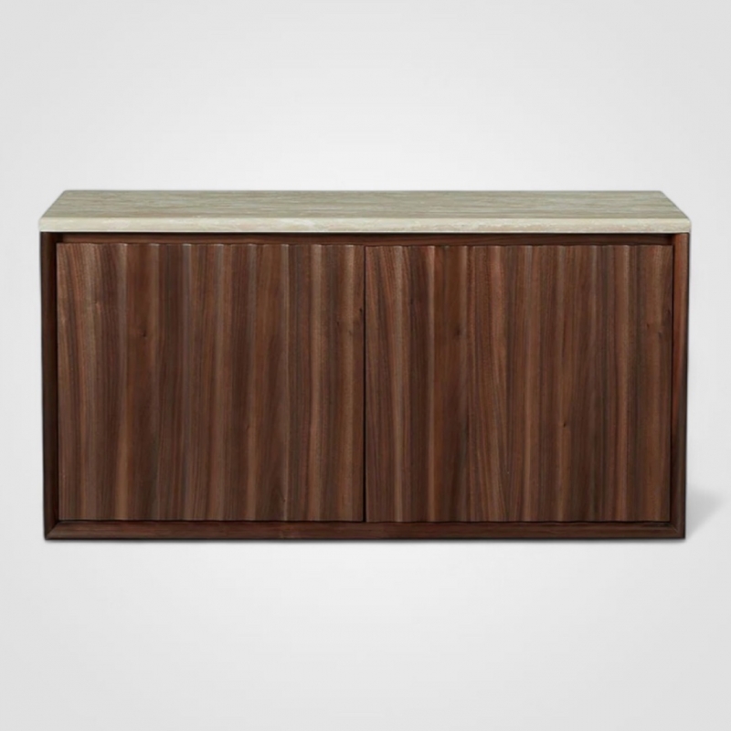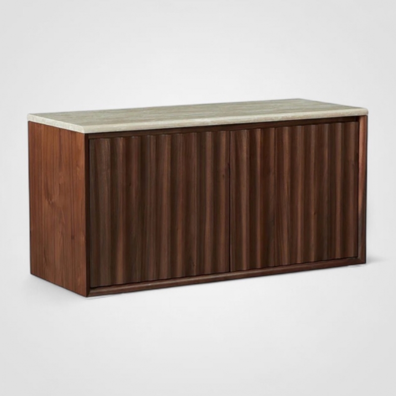 Столешница из травертина в мягком бежевом оттенке привлекает внимание природным рисунком камня, создавая благородный и спокойный акцент в интерьере. Корпус и фасады выполнены из МДФ и шпона американского ореха — породы, известной своей насыщенной палитрой и выразительной текстурой. Вертикальное рифление на дверцах придаёт тумбе динамику и подчёркивает её архитектурный характер.