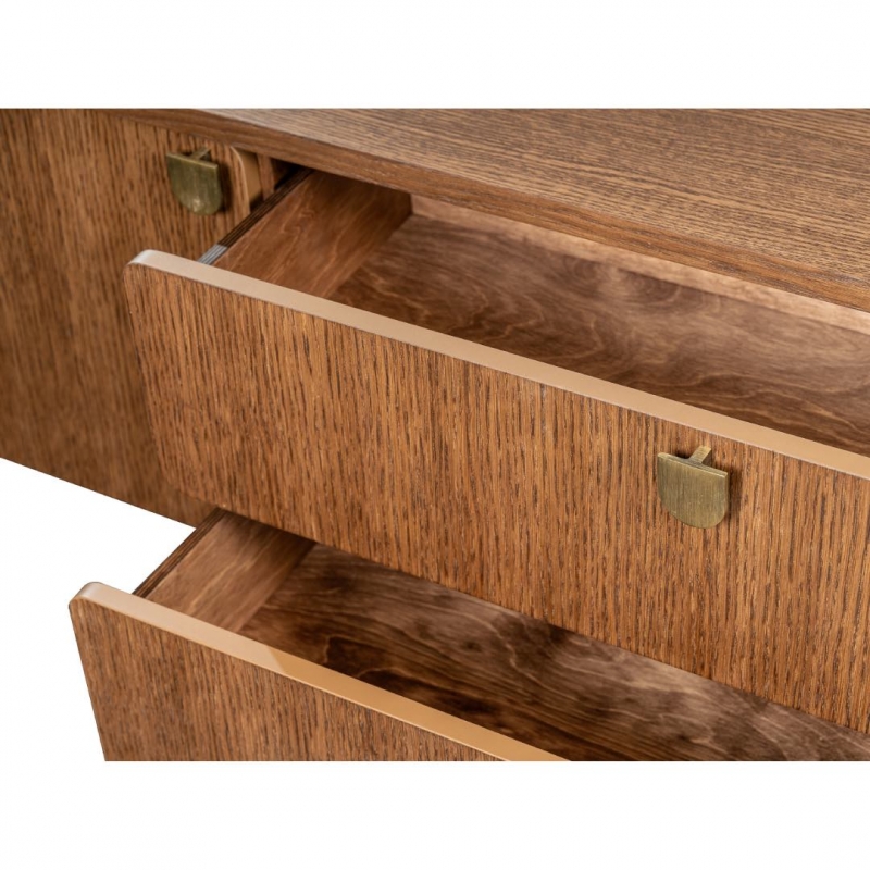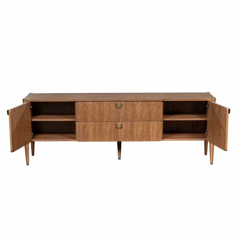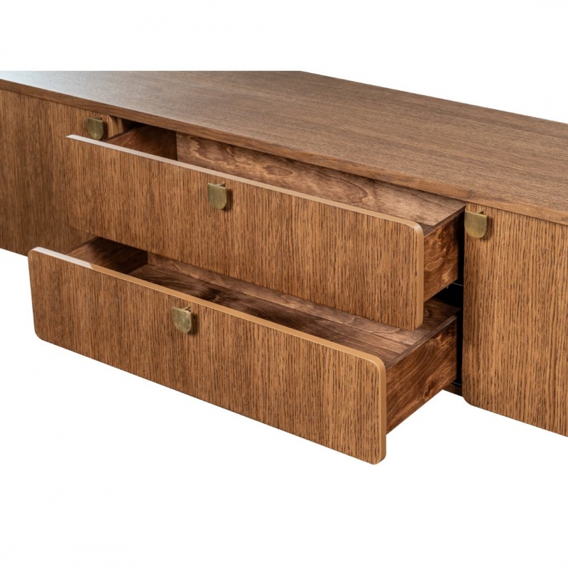 Тумба ТВ изготовлена из массива дуба, МДФ и шпона дуба, что обеспечивает прочность конструкции и долговечность эксплуатации.