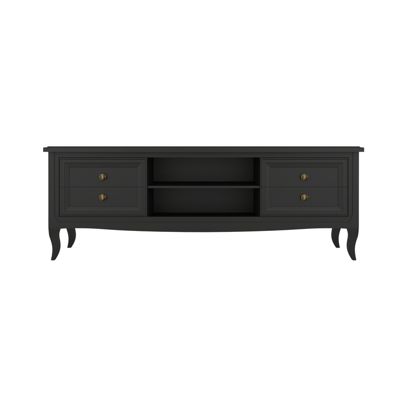 ТВ тумба Majessa (Aletan, арт. М304BL) с четырьмя ящиками и двумя нишами под тв приставку, в чёрном цвете — элегантное решение для гостиной в неоклассическом стиле. Комод Алетан Маджесса изготовлен из массива дерева и МДФ с многослойной эмалевой отделкой, гарантирующей долговечность.