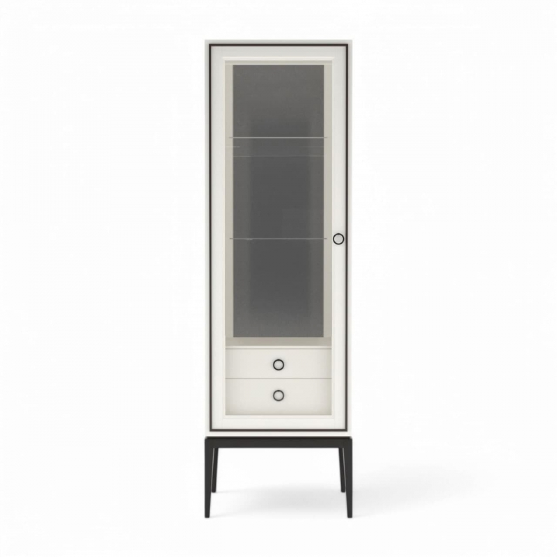 Дизайнерская однодверная левая витрина со стеклянными полками и дверками из коллекции Ницца бренда Classico Italiano, арт. 8021L/L/BL/BL. Дизайн выдержан в американском варианте стиля Ар-деко. Витрина выполнена на высоких ножках, выполненная из качественного массива бука и дополняется МДФ. Внутри витрины имеется три полки для хранения посуды или предметов коллекционирования, а также два ящика с доводчиками.