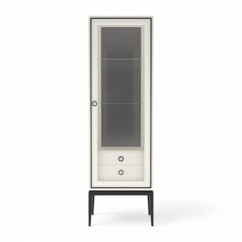 Дизайнерская однодверная правая витрина со стеклянными полками и дверками из коллекции Ницца бренда Classico Italiano, арт. 8021R/L/BL/BL. Дизайн выдержан в американском варианте стиля Ар-деко. Витрина выполнена на высоких ножках, выполненная из качественного массива бука и дополняется МДФ. Внутри витрины имеется три полки для хранения посуды и предметов коллекционирования, а также два ящика с доводчиками.