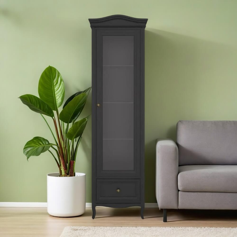 Однодверная витрина в правом исполнении Majessa (Aletan, арт. М601R/BL) с одним ящиком, в чёрном цвете — элегантное решение для гостиной в неоклассическом стиле. Идеальный вариант для хранения посуды или сувениров. Витрина Алетан Маджесса изготовлен из массива дерева и МДФ с многослойной эмалевой отделкой, гарантирующей долговечность.
