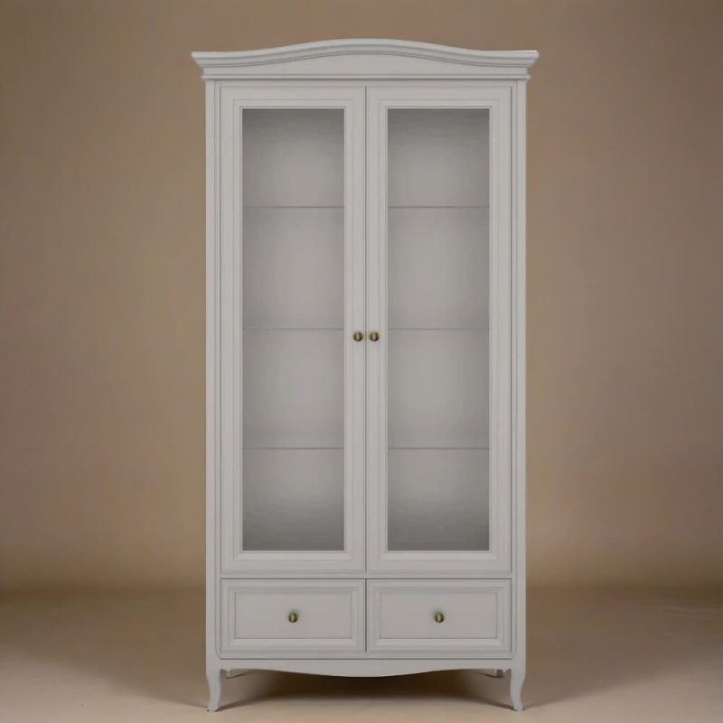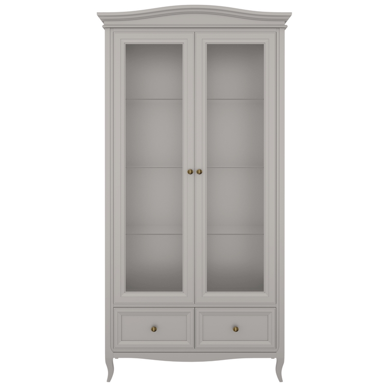 Двухдверная витрина Majessa (Aletan, арт. М603G) с двумя ящиками и зеркалом, в сером цвете — элегантное решение для гостиной в неоклассическом стиле. Идеальный вариант для хранения посуды или сувениров. Витрина Алетан Маджесса изготовлен из массива дерева и МДФ с многослойной эмалевой отделкой, гарантирующей долговечность.